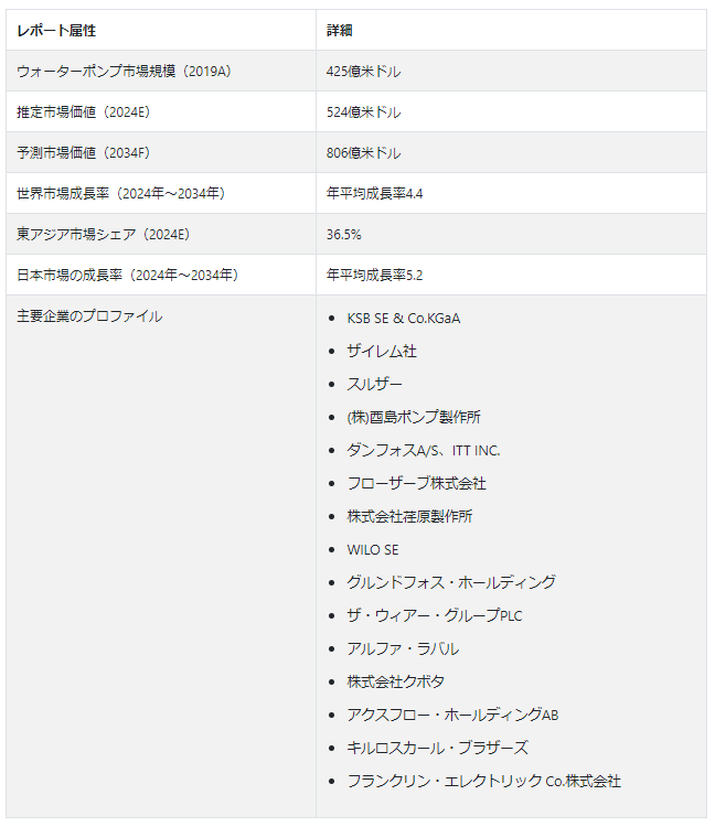 ウォーターポンプのグローバル市場:ポンプタイプ別(遠心式ポンプ、容積式ウォーターポンプ、その他)、最終用途別、地域別(2024年~2034年)