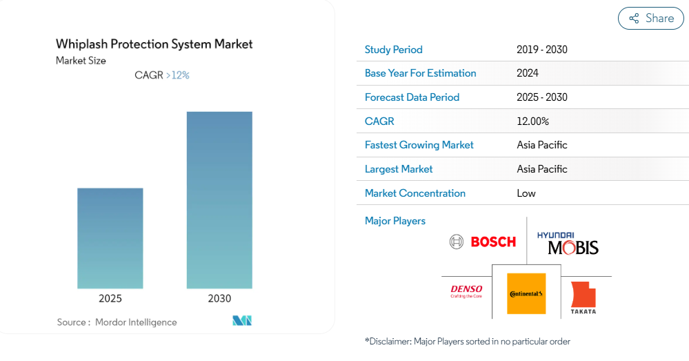 むち打ち症防止システム市場は、予測期間中に12%を超える年平均成長率(CAGR)を記録すると見込まれております。